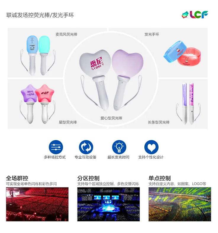 悟空體育場控?zé)晒獍舨捎米钚碌腖ED光源技術(shù)和2.4G通訊技術(shù)。支持群控、區(qū)控、點控等多種場控控制方式,能夠根據(jù)演唱會現(xiàn)場需求,實現(xiàn)靈活多變的燈光效果布局。無論是整個場館的統(tǒng)一變色,還是特定區(qū)域的獨立展示,甚至是單個熒光棒的精準控制,都能輕松實現(xiàn),為演唱會帶來前所未有的視覺震撼和互動體驗。